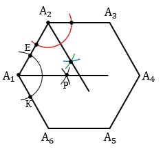 Сначала опишем около данного шестиугольника А1А2А3А4А5А6 окружность. Для этого построим биссектрисы углов А1 и А2. Чтобы построить биссектрису угла А1, строим окружность произвольного радиуса с центром в точке А1 (полностью окружность строить необязательно, смотри выделенное красным цветом), данная окружность пересечет стороны А1А2 и А1А6 угла А1 в точках Е и К. Затем строим две окружности с центрами в точках Е и К радиуса ЕК (полностью окружности строить необязательно, смотри выделенное синим и зеленым цветом), данные окружности пересекутся в точке Р. Далее проводим луч А1Р, который и будет биссектрисой угла А1.