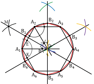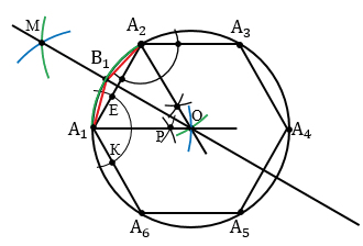 Далее нужно каждую из дуг А1А2, А2А3, А3А4, А4А5, А5А6, А6А1 разделить пополам. Чтобы разделить дугу А1А2 пополам, построим серединный перпендикуляр к отрезку А1А2. Для этого строим две окружности с центрами в точках А1 и А2 радиуса А1А2 (полностью окружность строить необязательно, смотри выделенное красным цветом). Данные окружности пересекутся в двух точках, одну обозначим буквой М, а другая совпадет с точкой О, т.к. у шестиугольника сторона равна радиусу (с другими многоугольниками совпадения с точкой О не будет) . Затем проводим прямую МО, данная прямая пересечет дугу А1А2 в точке В1, которая и разделит дугу А1А2 пополам. Далее точку В1 соединяем с концами А1 и А2 дуги А1А2.