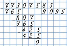 Нахожу четвёртую цифру частного: 425 : 85, получу 5. 425 - 425 = 0. Частное - 9095.