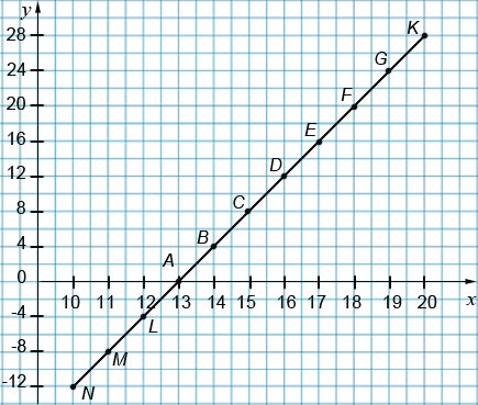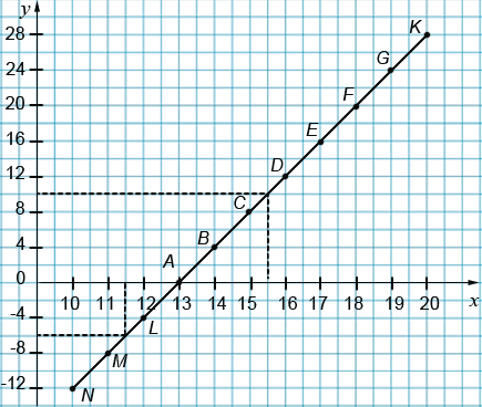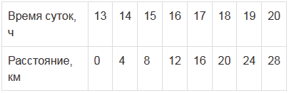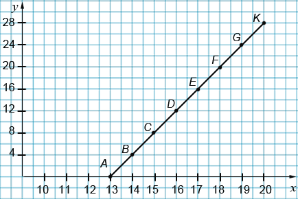 Изобразим пары чисел, данные в каждом столбике точками на координатной плоскости (это пары (13; 0), (14; 4), (15,8) и т.д.) При этом по оси абсцисс выберем масштаб 1 см равен 1 часу, а по оси ординат 1 см равен 4 км (обратите внимание, что по оси абсцисс мы начинаем отсчет не с нуля). Мы получим точки А, B, C, D, E, F, G, K. Эти точки будут лежать на одной прямой: