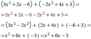 | Чтобы найти сумму многочленов, нужно взять эти многочлены в скобки и поставить между ними знак "плюс". Затем нужно раскрыть скобки и привести подобные слагаемые. |