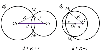 Если окружности имеют две общие точки, то говорят, что они пересекаются. На рисунках 2 а, б окружности пересекаются в двух точках М1 и М2. Обратите внимание, в этом случае d < R + r или d > R - r.
