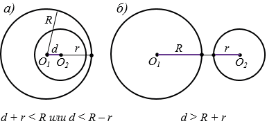 все точки окружности с центром О2 являются внутренними точками относительно окружности с центром О1. В таком случае говорят, что одна окружность лежит внутри другой, при этом d < R - r. На рисунке 4, б окружности не имеют общих точек и ни одна из них не лежит внутри другой. В таком случае говорят, что окружность с центром О2 лежит вне окружности с центром О1, при этом d > R + r.